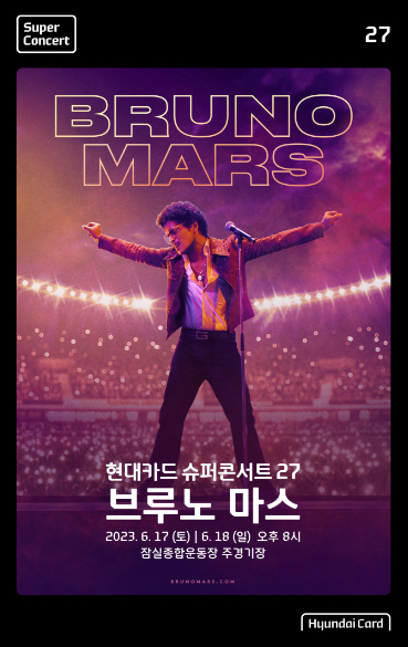 현대카드는 오는 6월 17일과 18일 서울 잠실종합운동장 주경기장에서 '현대카드 슈퍼콘서트 27 브루노 마스(Bruno Mars)'를 개최한다고 20일 밝혔다.