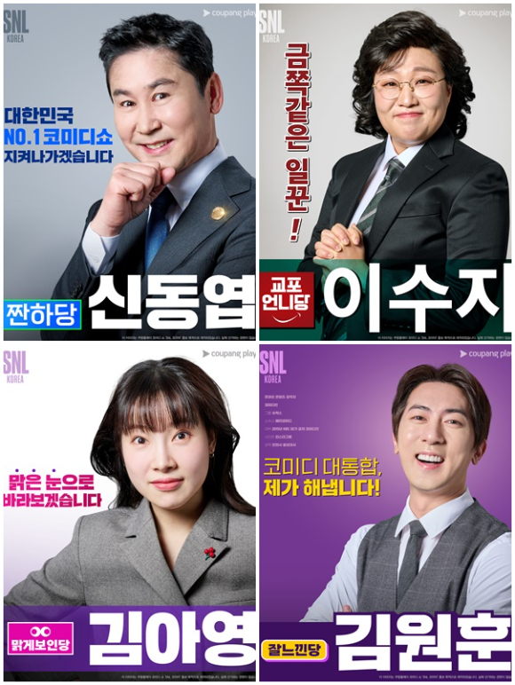 'SNL 코리아'가 10일 제 22대 국회의원 선거를 앞두고 선거 패러디 포스터를 전격 공개했다. 쿠팡플레이 코미디 쇼 'SNL코리아'가 공개한 패러디 포스터는 크루 15인의 당찬 포부와 공약을 담고 있다